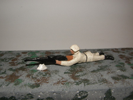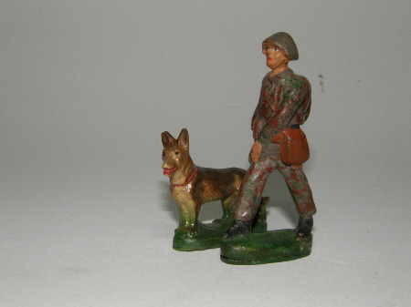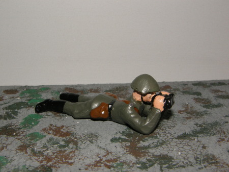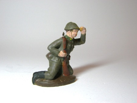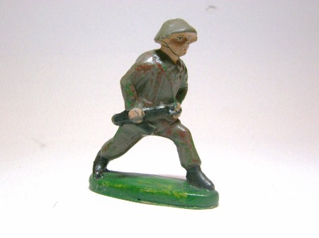 Eine wirkliche Besonderheit ist diese Figur aus der LISANTO-Produktion. Durch die ANKER-Werke Eisfeld in Auftrag gegeben diente die Figur als Beigabe für den neu entwickelten T 34 - Panzer. Da der Panzer auch für den Export vorgesehen war wurde der Figur ein Tarncape "angezogen". So ließ sich die Figur keiner Armee mehr zuordnen und konnte problemlos allen Exportaufträgen beigegeben werden. Der Stift an der Figurenrückseite ermöglichte, die Figur seitlich auf den T 34 aufzusetzen und so ein Mitfahren zu realisieren.