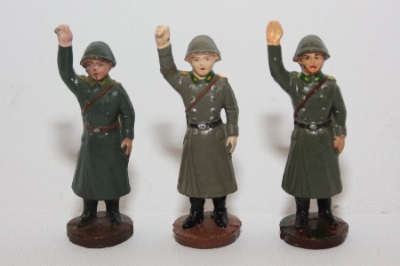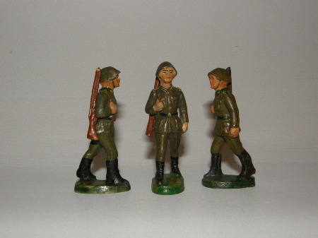 Das Bild zeigt drei verschiedene Wachsoldaten aus der Blechschmidt-Produktion. Die linke Figur zeigt einen Anghörigen der Landstreitkräfte, die rechte einen Grenzsoldaten. Bei der mittleren Figur handelt es sich um eine der seltenen Blechschmidt-Figuren aus Kunststoff. Derartige Figuren wurden nur kurz produziert.